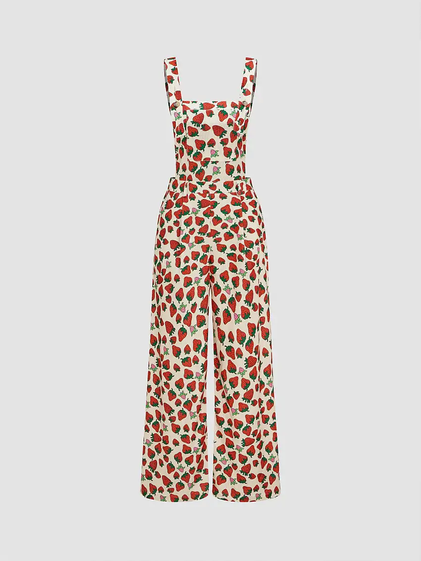Sale!Woven Strawberry Print Wide Leg Jumpsuit