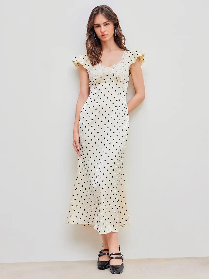 Sale!Woven Sweetheart Polka Dot Lace Trim Maxi Dress