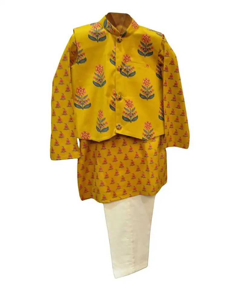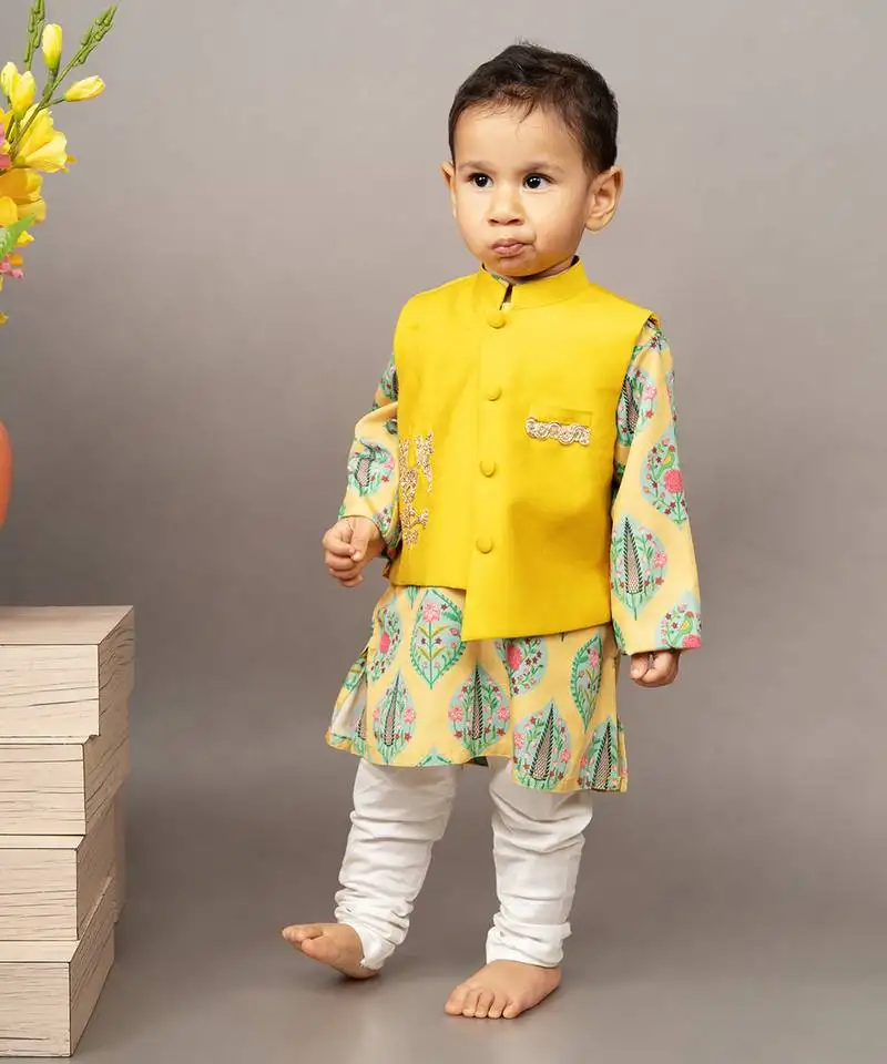 Yellow kurta silk printed floral bundi jacket set