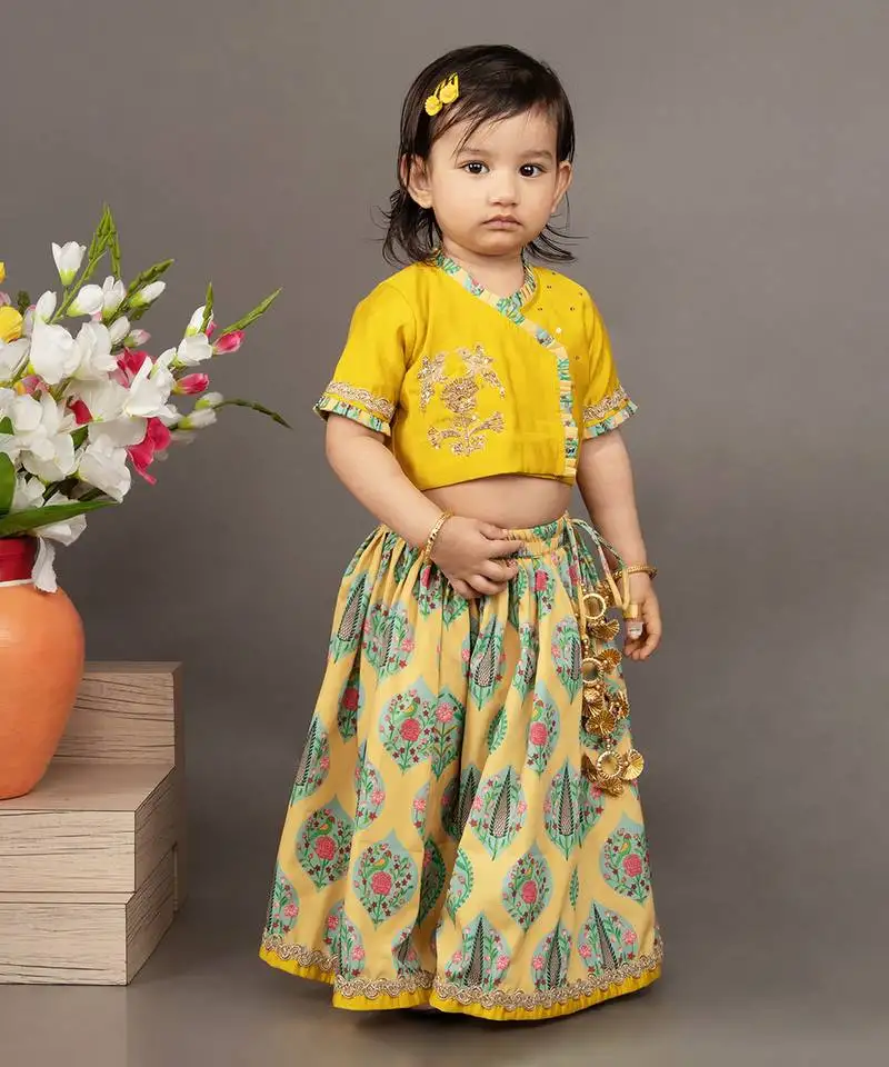 • Yellow silk printed floral blouse and ghagra set