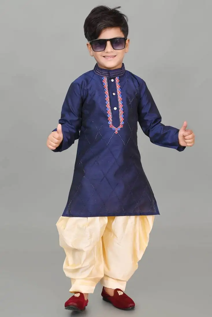 Sale!Nfc creation embroidery work navy blue dupion silk kurta and patiyala set for boys