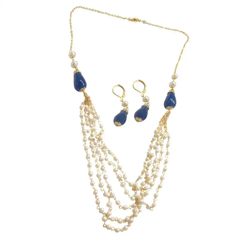 Sale!9blings pearl blue stone multistrand necklace earring set