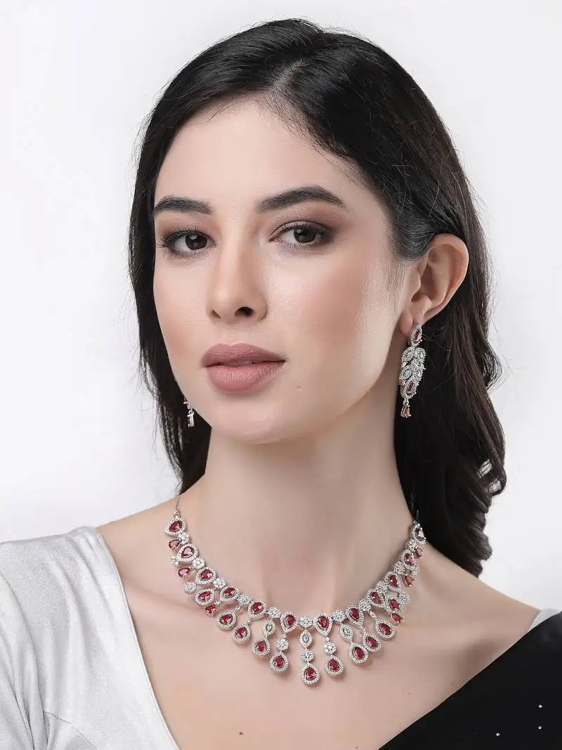 Sale!Women silver plated maroon cz stone handcrafted jewellery set