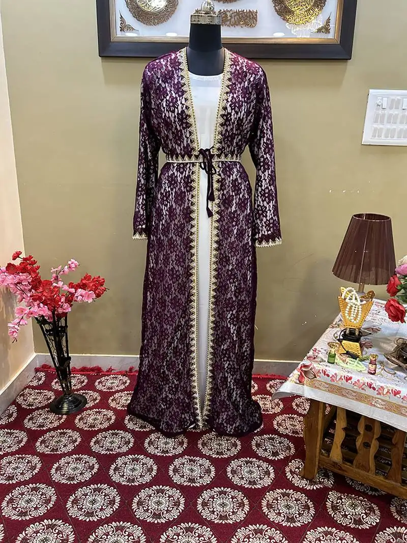 Wine zari work stones & beads embellish georgette islamic style arabian maxi partywear kaftan