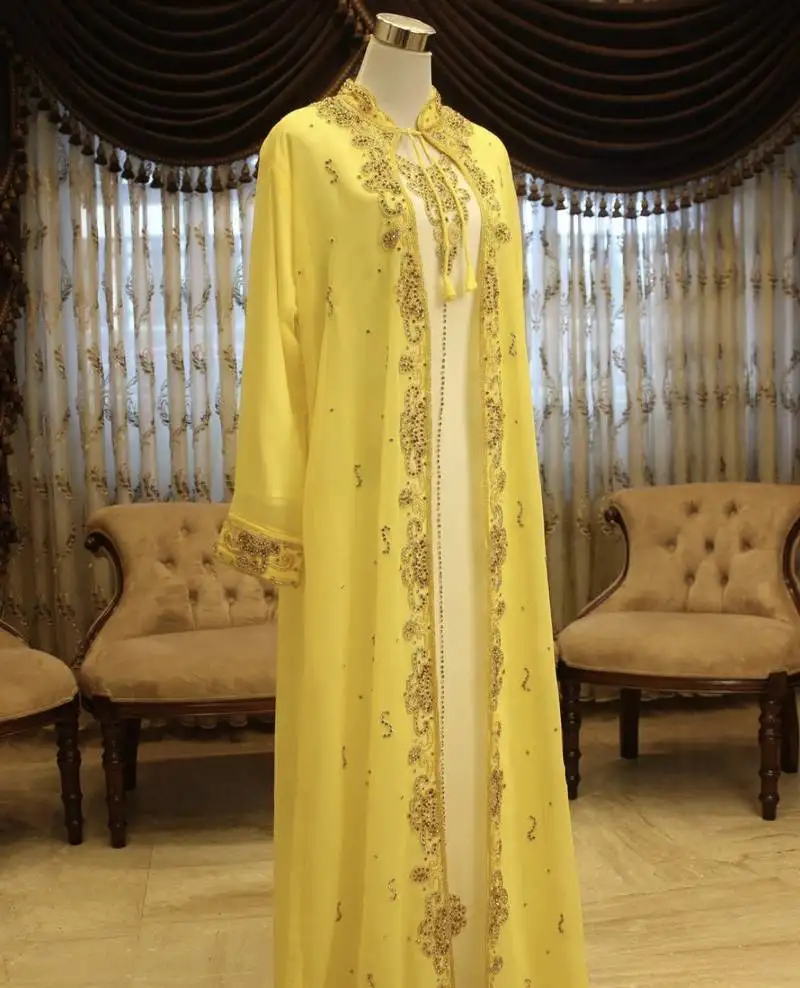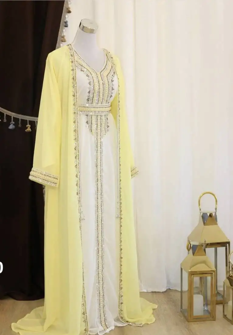 • Yellow & white color luxurious handmade moroccan kaftan with hijjab
