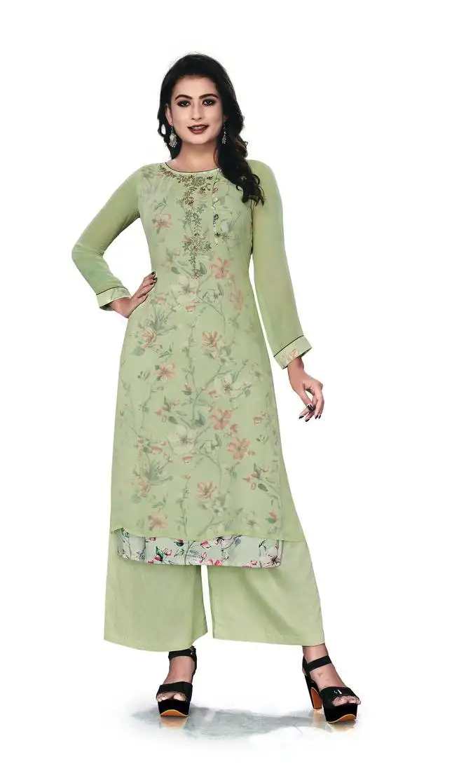 Women’s and girls pista green georgette neck embroidered georgette kurta sets