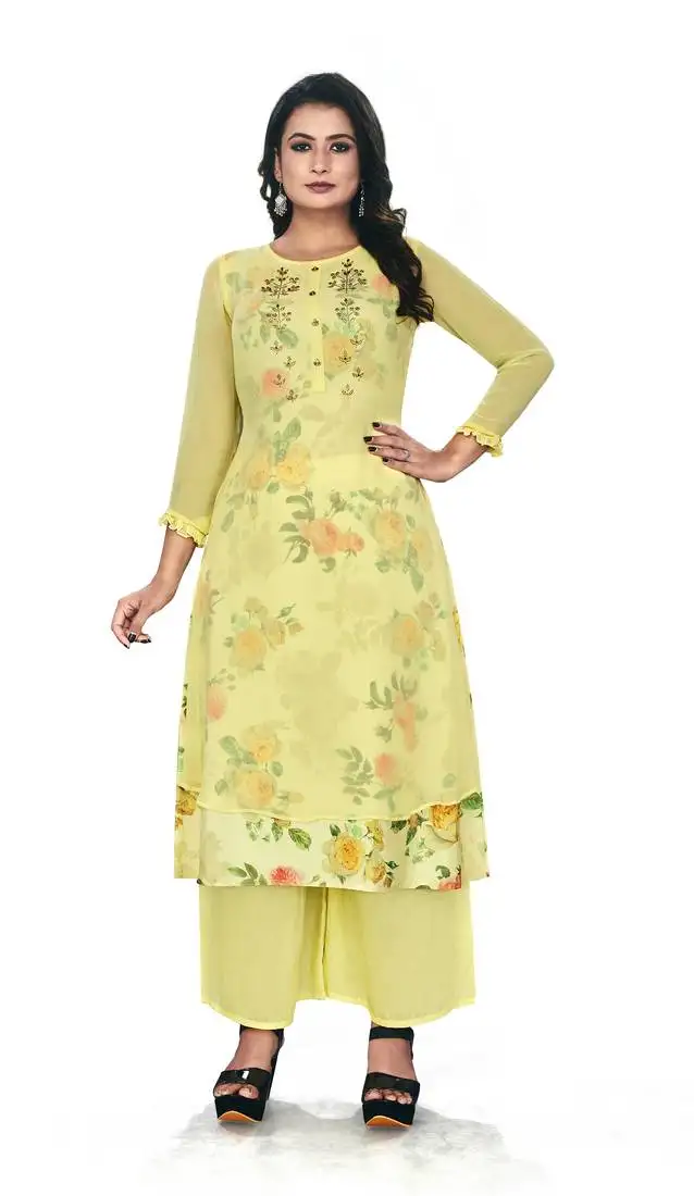 • Women's and girls lemon yellow georgette neck embroidered georgette kurta sets