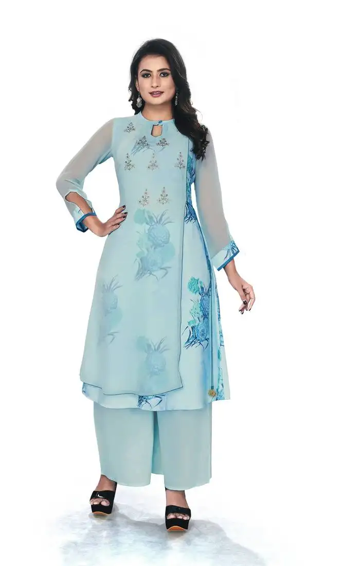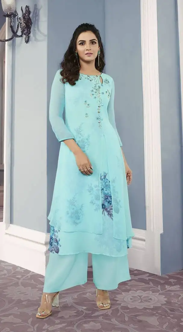 Xclusive sky blue georgette floral printed double layered sarwoski work kurta with palazzo sets