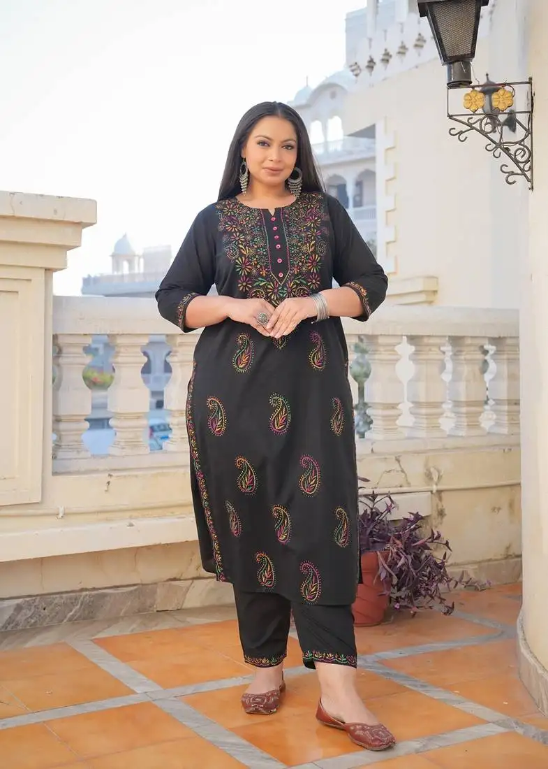 • Women's black plus size cotton chicken embroidery printed straight kurta set (black)