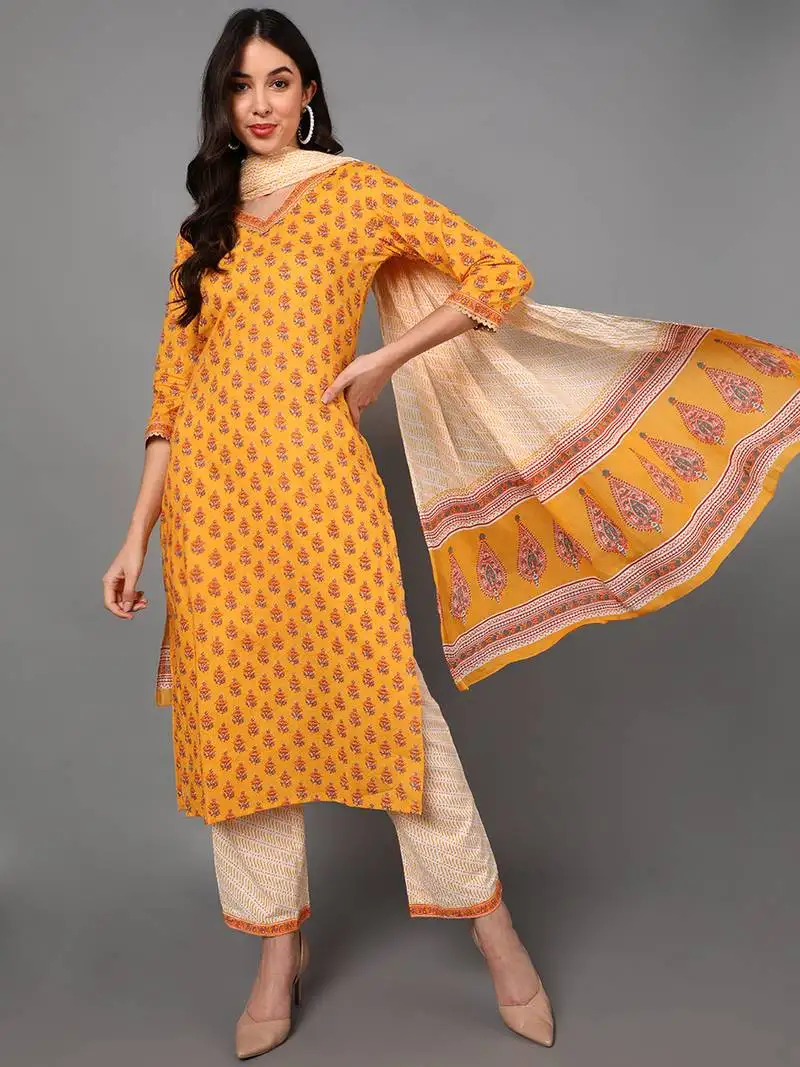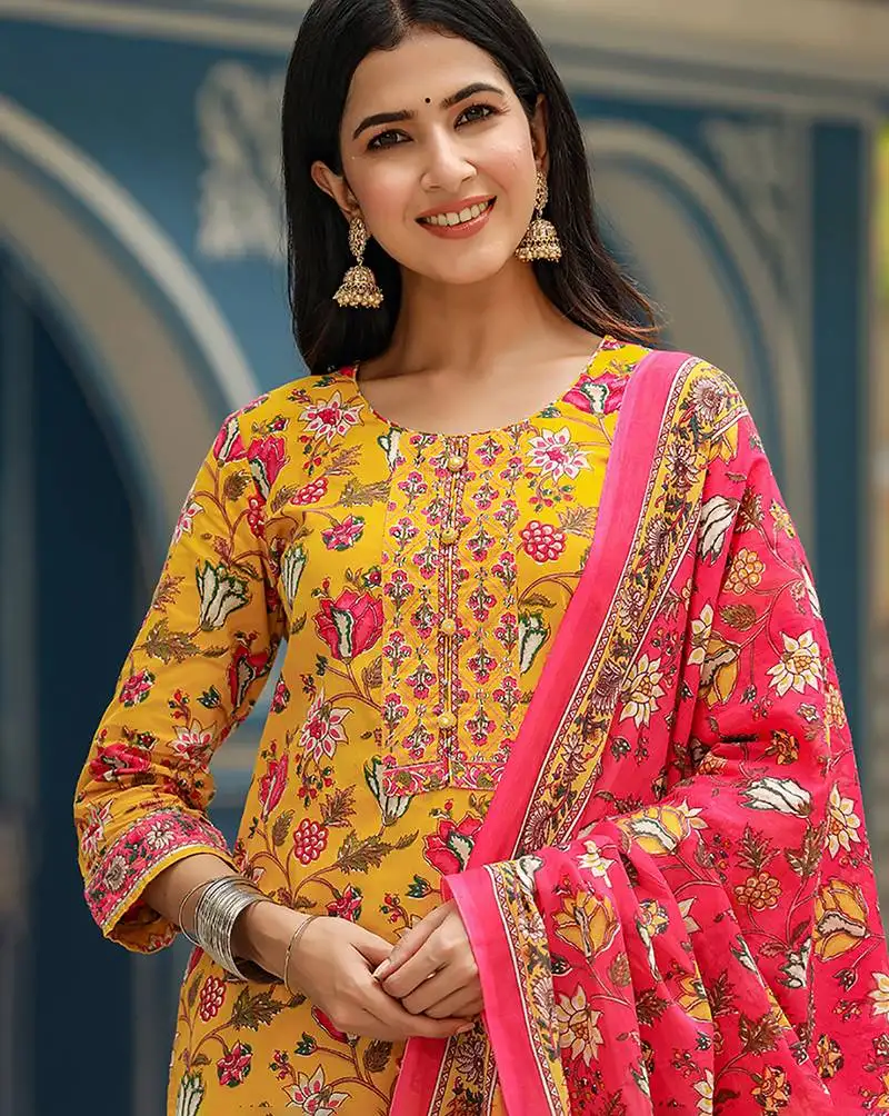 • Yellow color printed pure cotton styles kurta trouser with dupatta