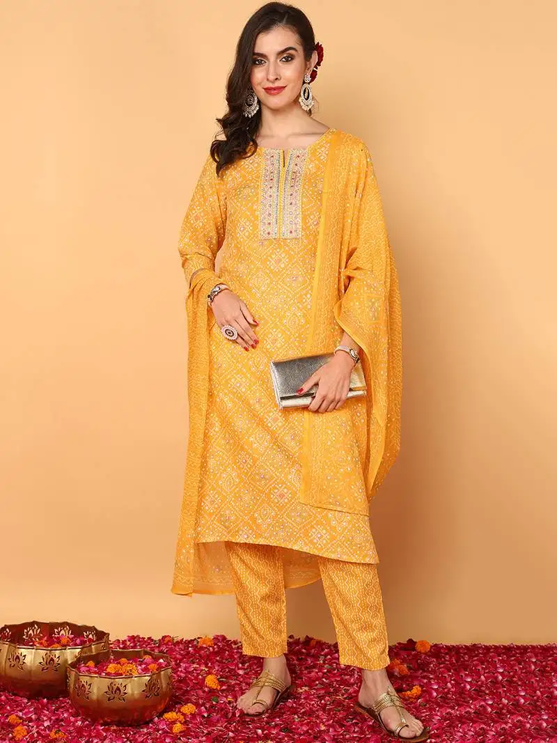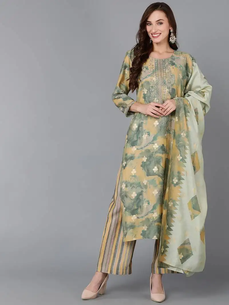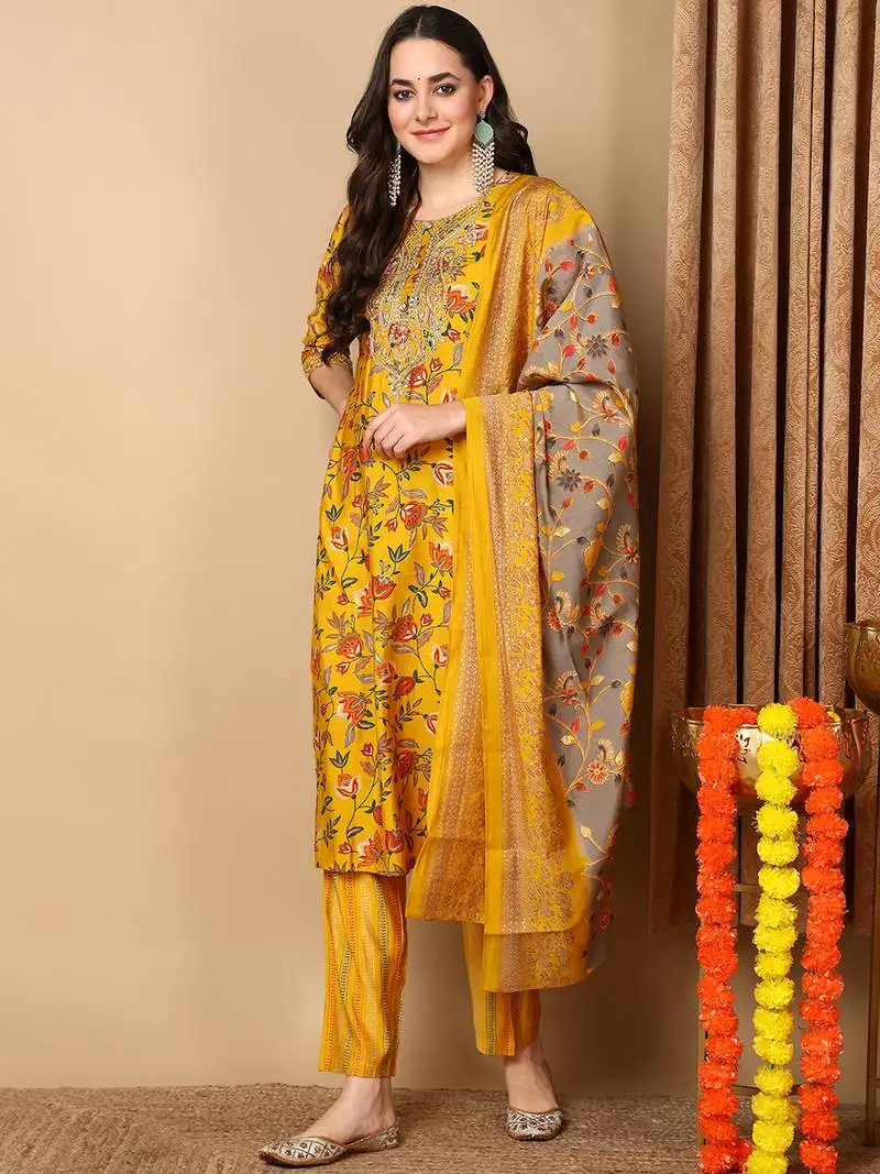 Yellow color printed silk blend styles kurta trouser with dupatta