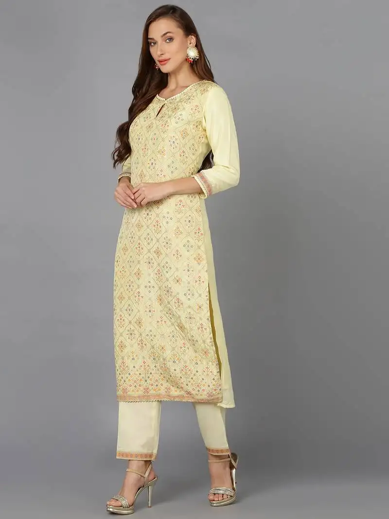 • Yellow color printed rayon styles kurta trouser with dupatta