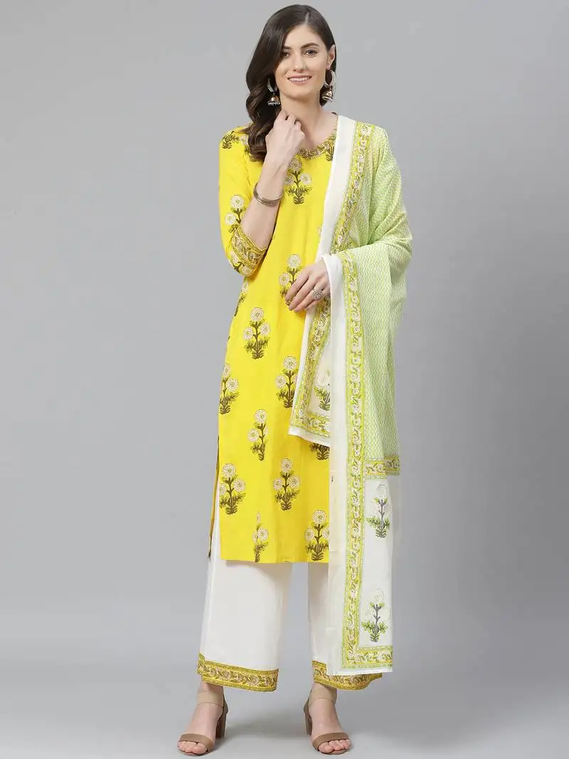 Yellow color printed pure cotton styles kurta palazzo with dupatta