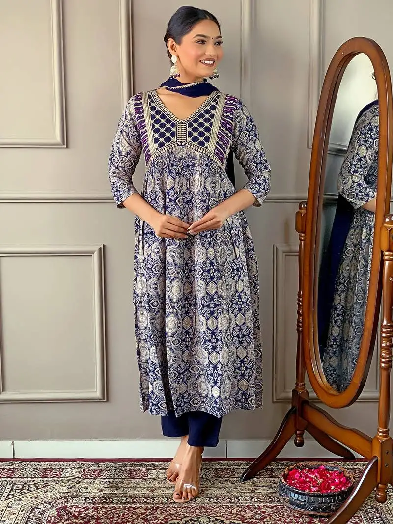 Sale!Blue women printed and embroidered rayon kurta pant dupatta set
