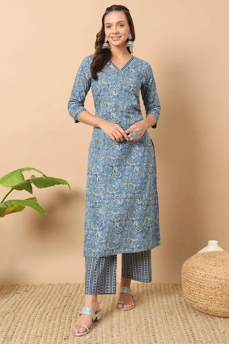Sale!Blue colour designer printed ethnic cotton partywear kurti bottom set