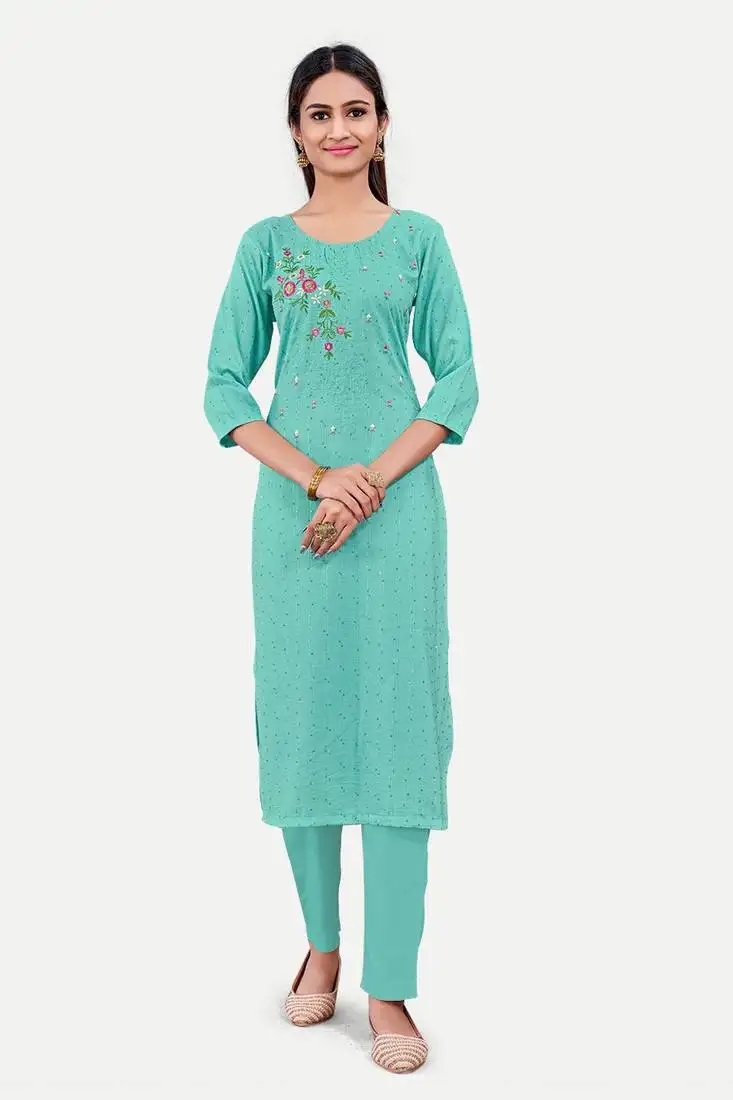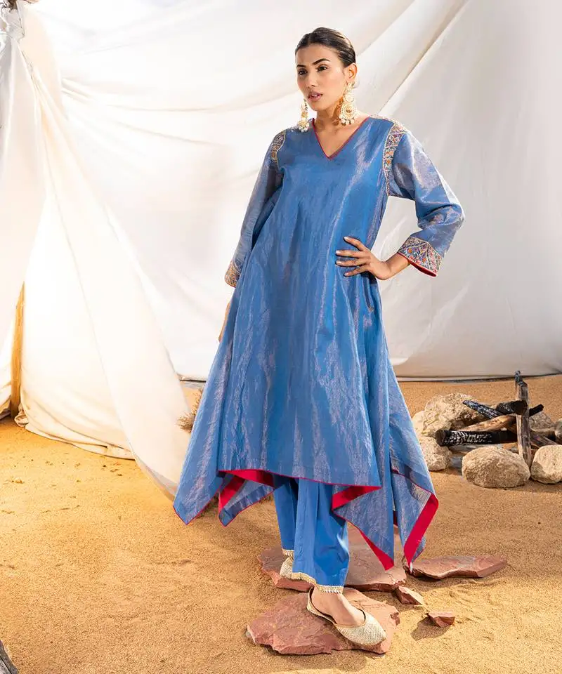 Sale!Blue kantha work cotton a-line kurta with payjama set stitched