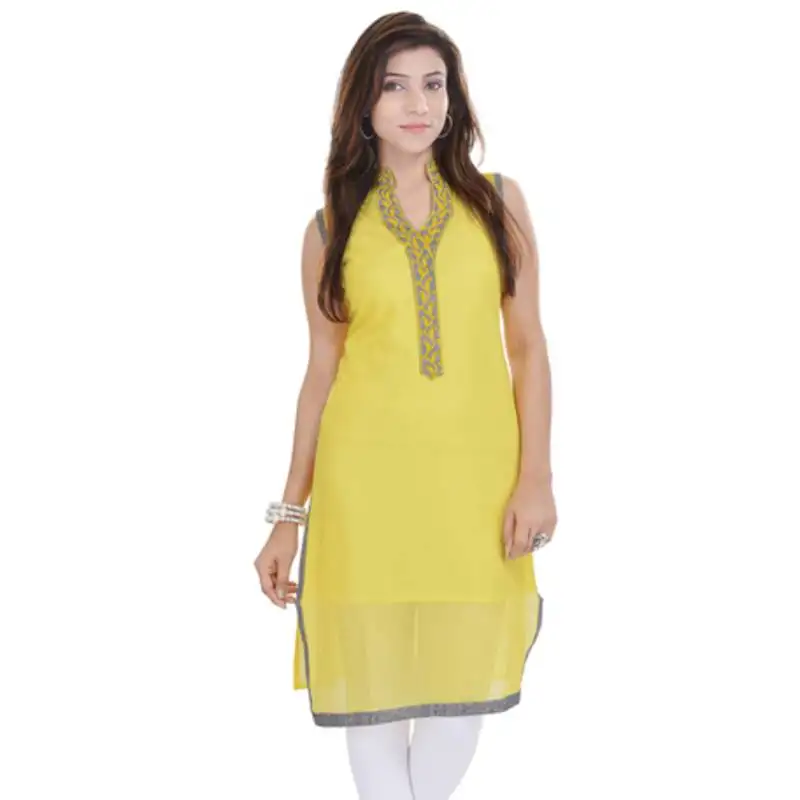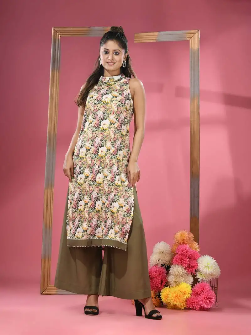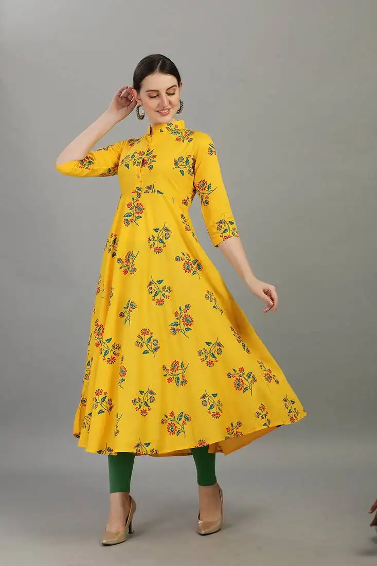 • Yellow floral printed rayon collar neck long anarkali kurti