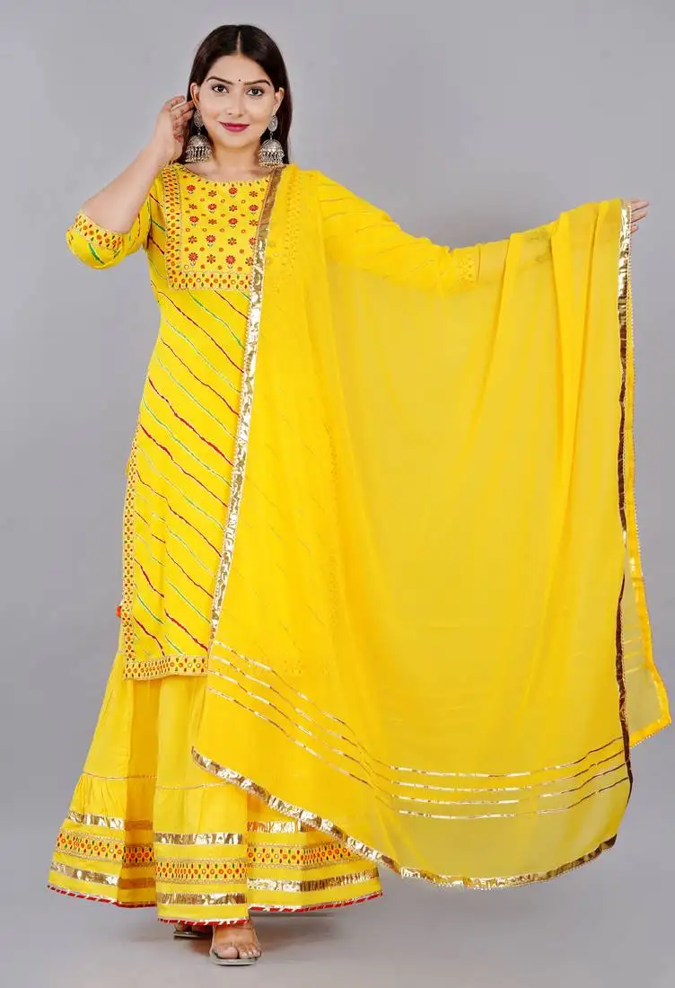 • Yellow embroidered pure cotton printed kurta skirt with dupatta set