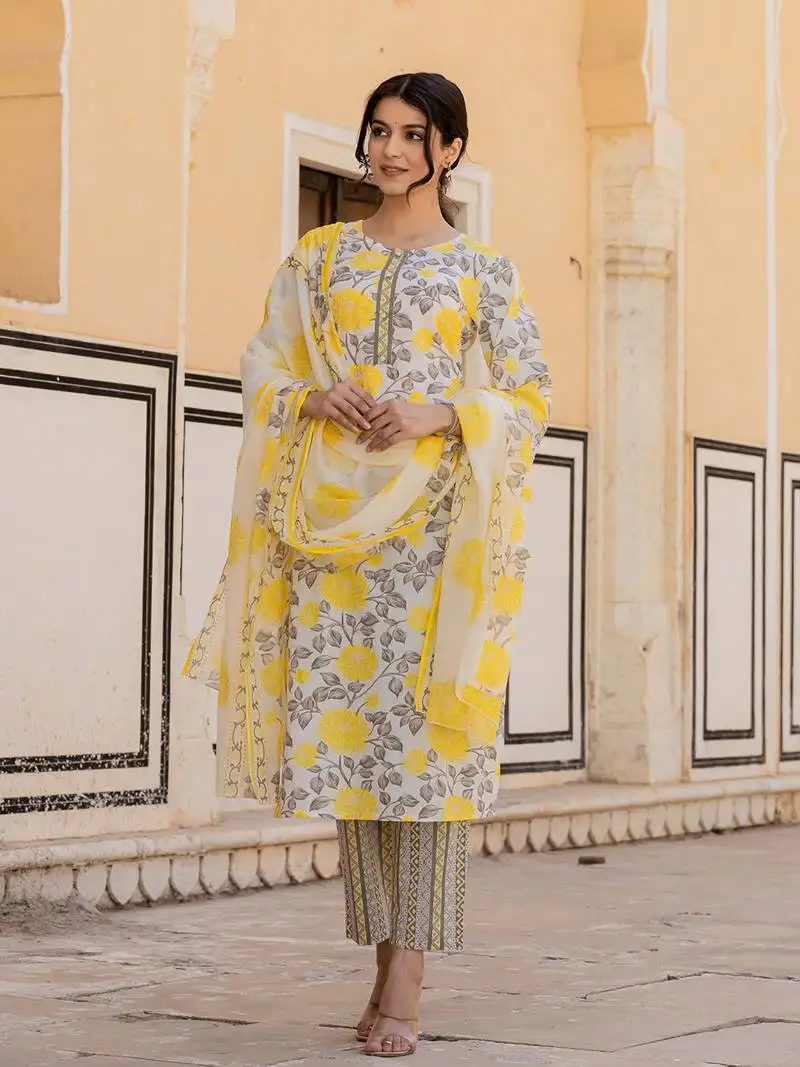 • yellow ethnic motifs cotton straight kurta and trouser with dupatta set