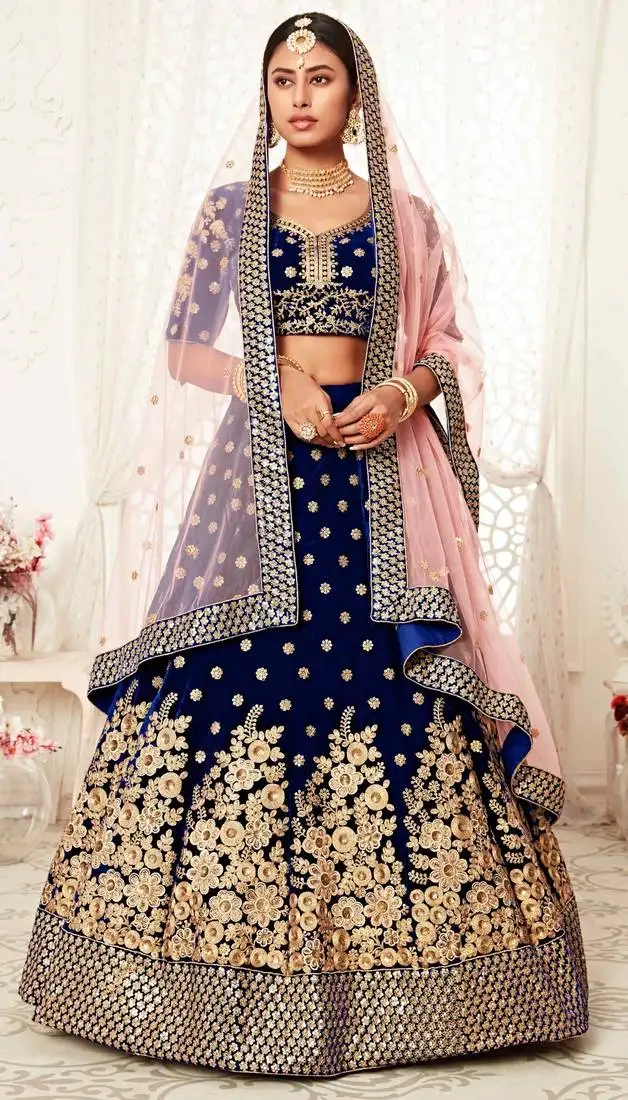 Sale!Alluring navy-blue zari, sequins and thread embroidered velvet fabric lehenga choli for bridal