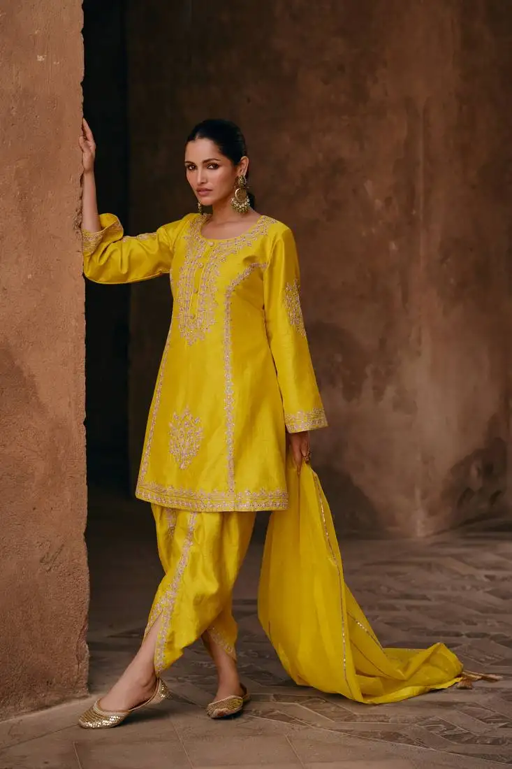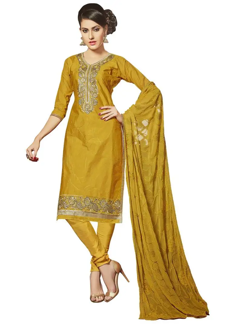 Sale!Yellow embroidered chanderi salwar with dupatta unstitched