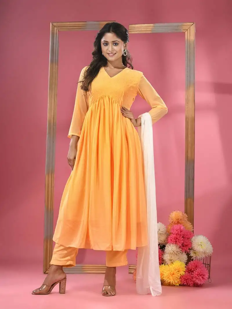 Sale!Yellow embellished gathered georgette suit set with dupatta stitched