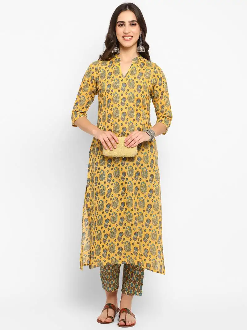 Sale!Yellow cottonprinted kurta with pant stitched