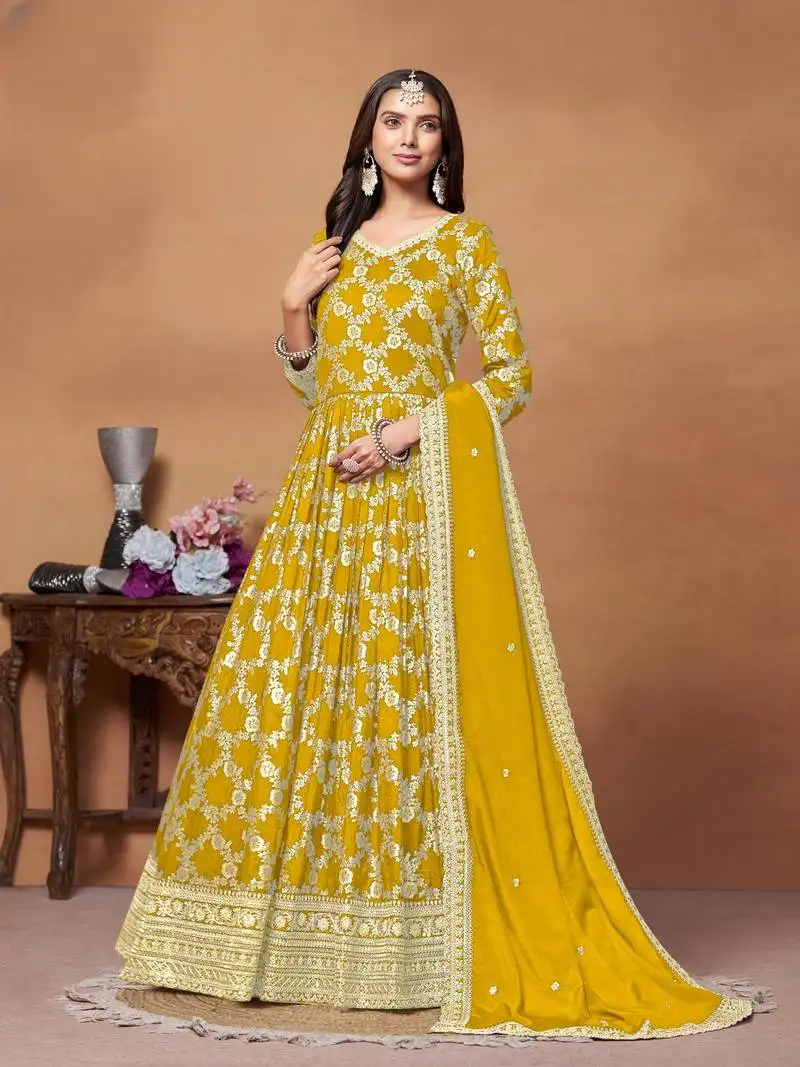 Sale!Yellow embroidered dola jacquard semi stitched anarkali suit