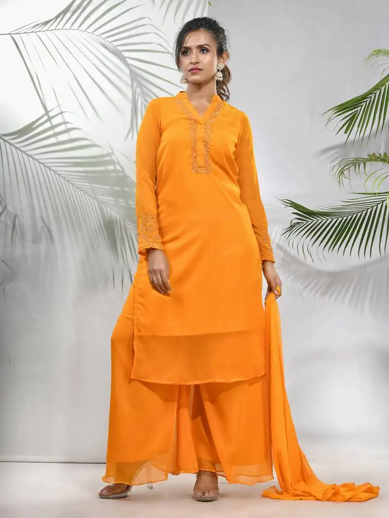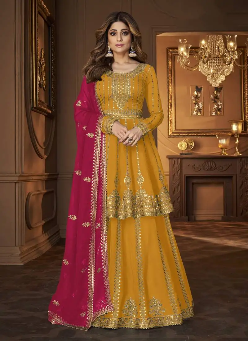 Yellow faux georgette embroidered party wear salwar suits with palazzo stitched