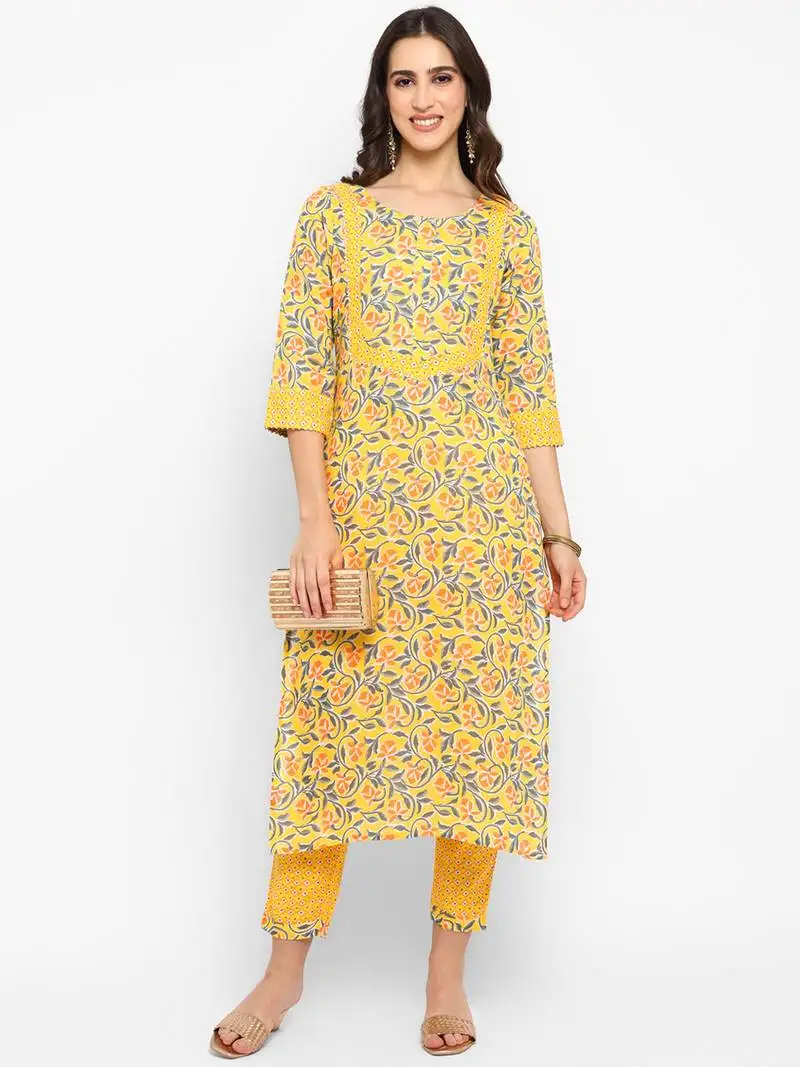 • Yellow georgette floral printed kurta & palazzo set stitched