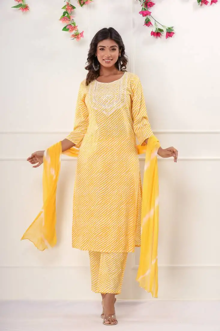 Sale!Yellow leheriya printed with embroidered work cotton straight kurta with pant and dupatta set stitched