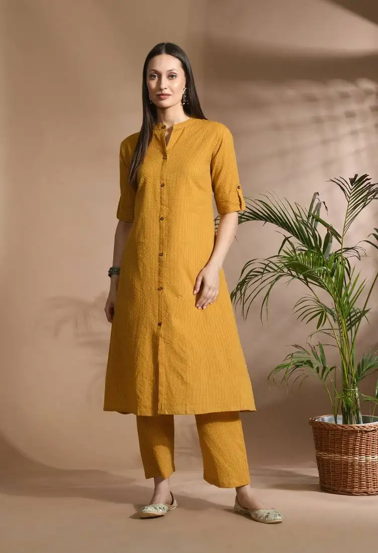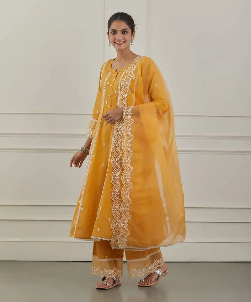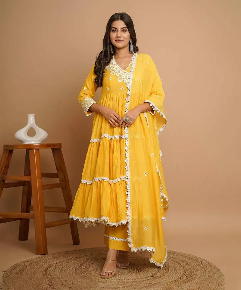 Sale!Yellow kantha work cotton a-line kurta with payjama set stitched