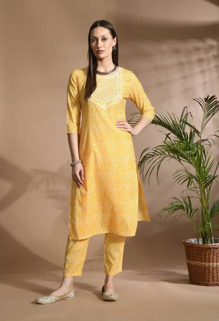 Sale!Yellow leheriya printed with sequin work cotton straight kurta with payjama set stitched