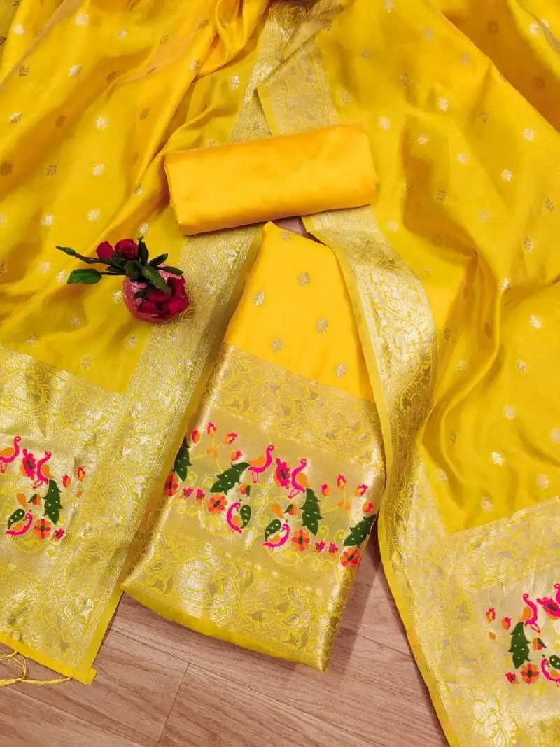 • Yellow soft banarasi silk zari woven design dress material unstitched