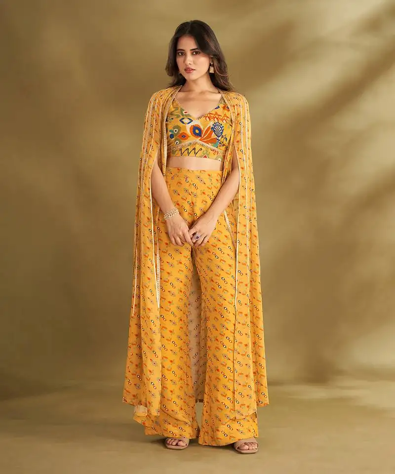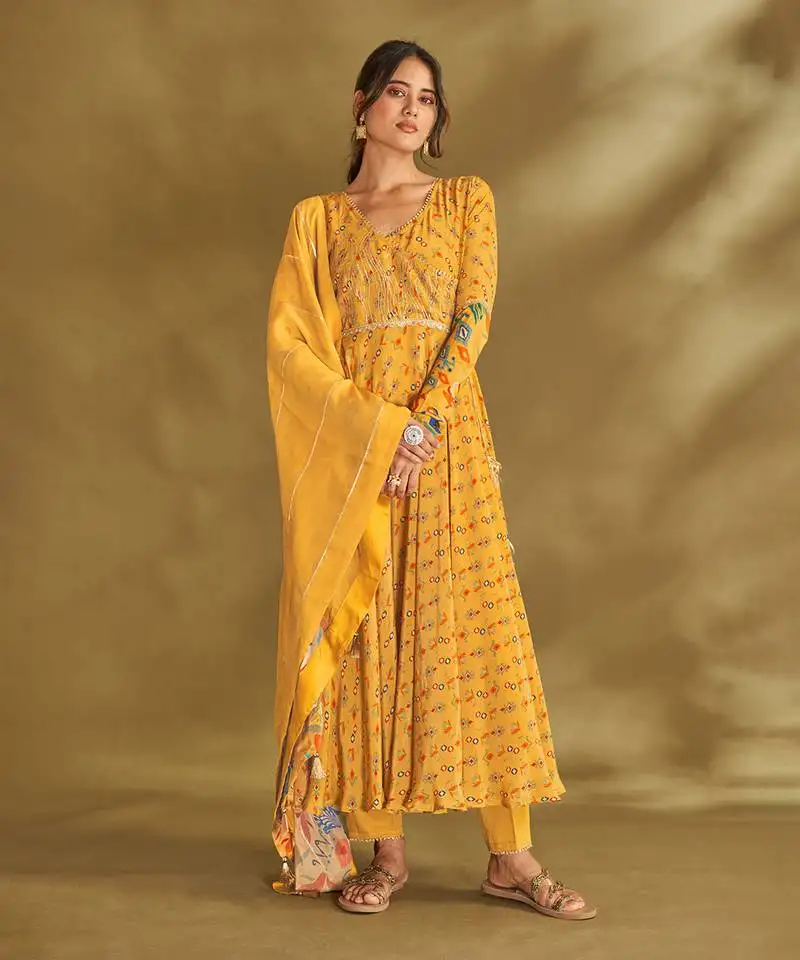 • Yellow solid silk blend embroidered fancy anarkali trousers with dupatta