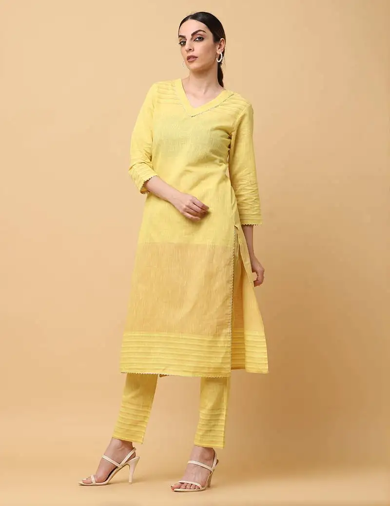 Yellow south cotton solid & trim work straight kurta pant (set of 2) stitched