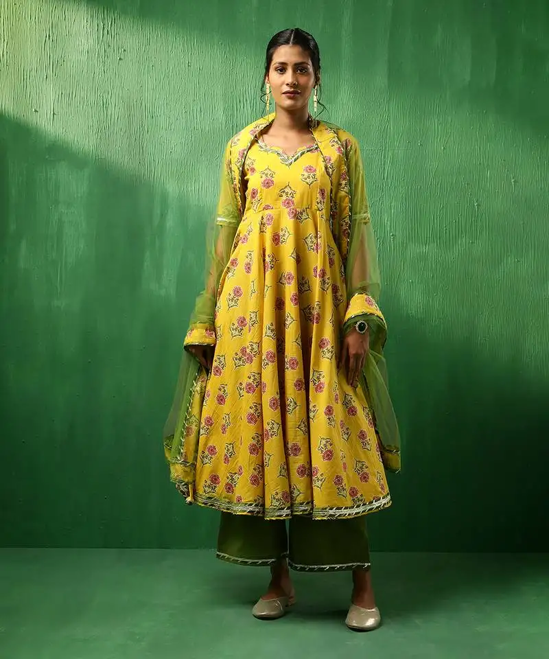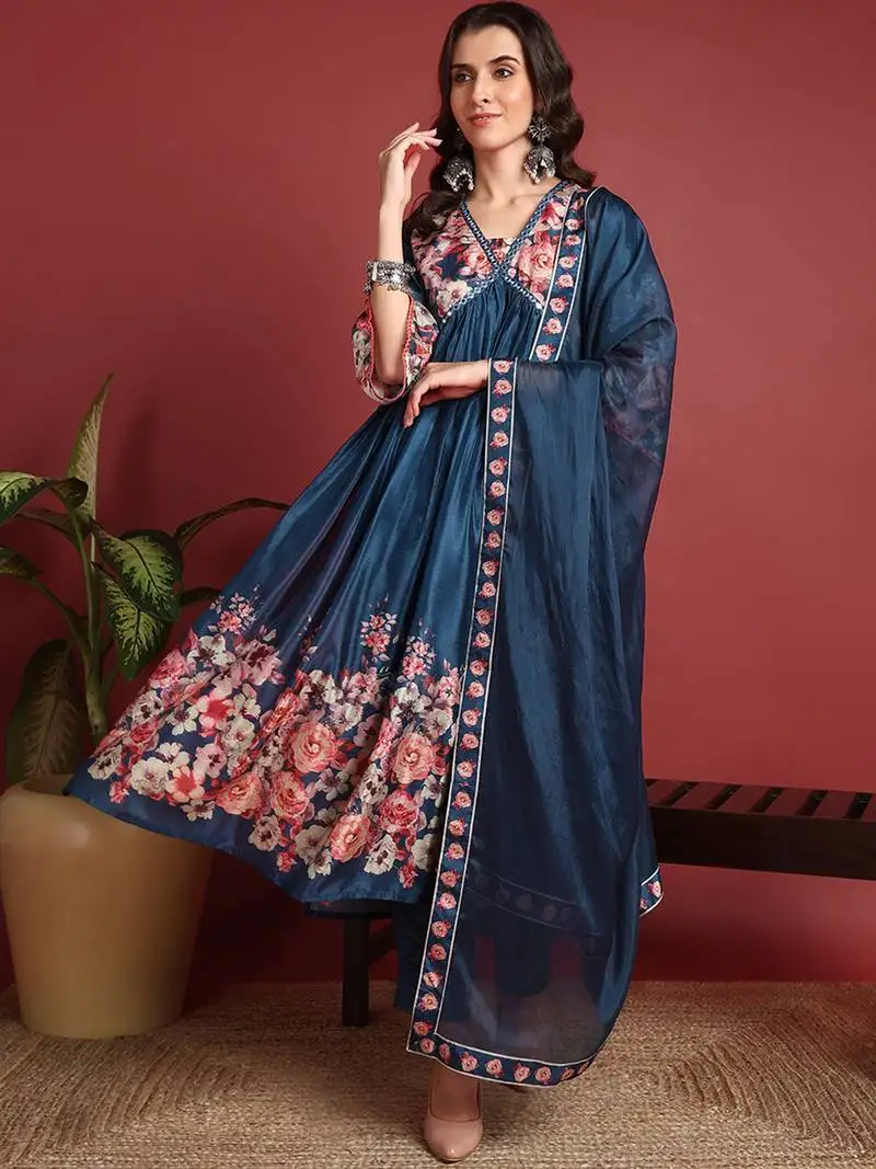 • Ahika women blue silk blend floral printed a-line kurta trouser with dupatta stitched