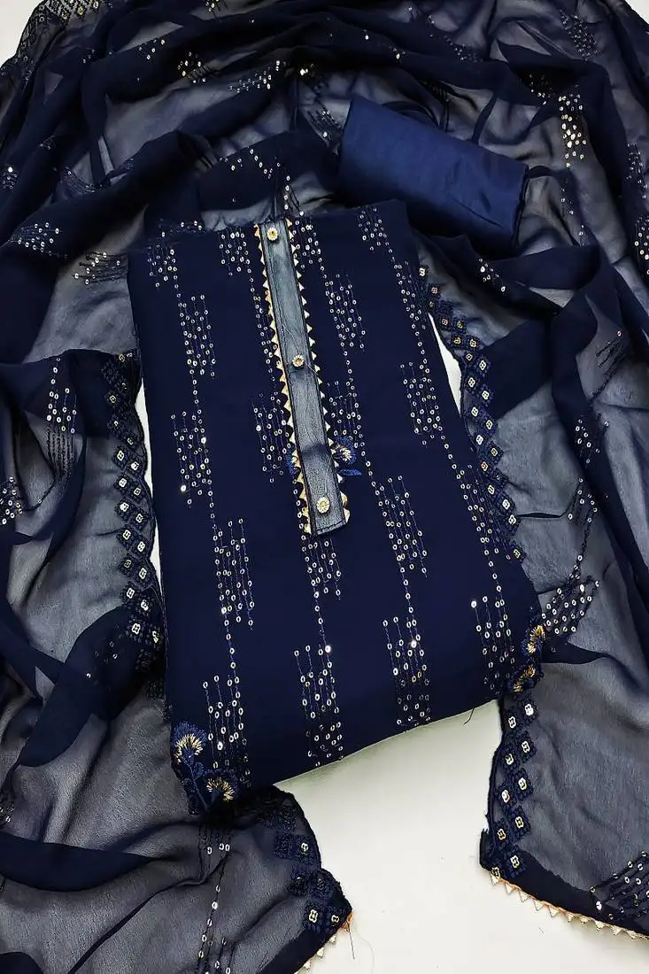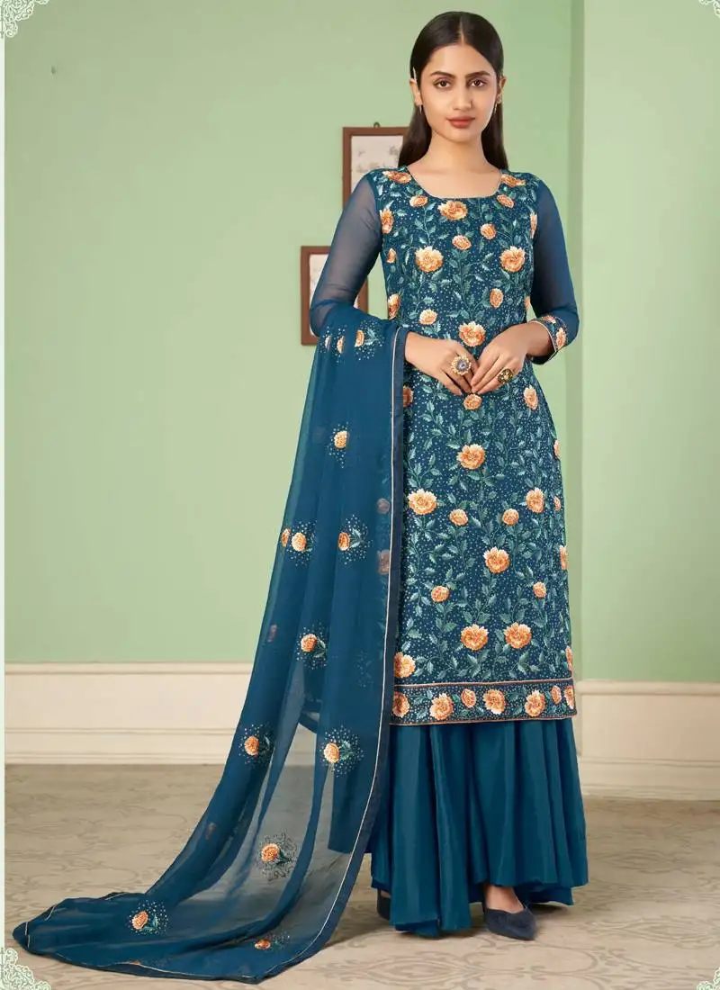 • Aqua blue georgette embroidery designer sharara suit semi stitched