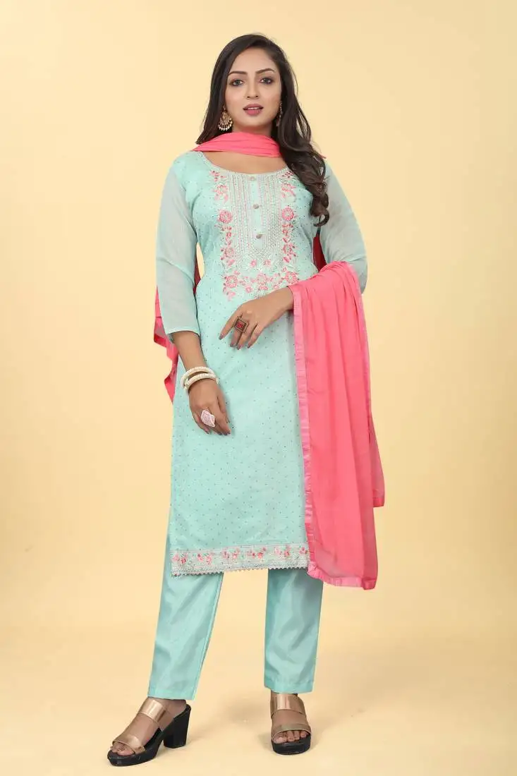 Sale!Beautiful aqua colour sober touch chanderi suit for festive season unstitched