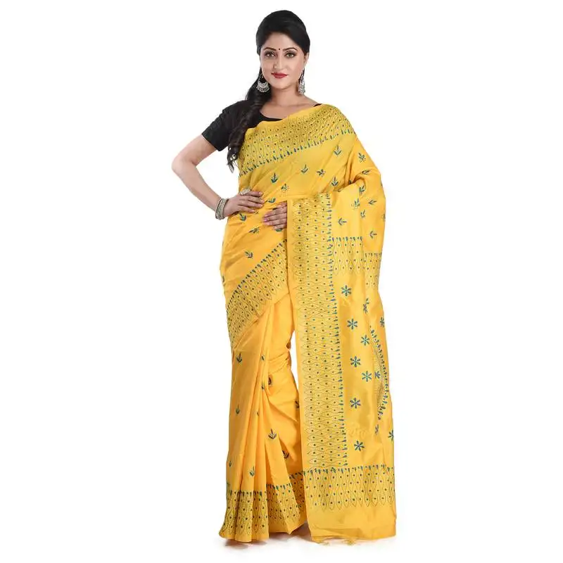 Aishani collection hand embroidery kantha stitch handloom saree with bp (yellow)