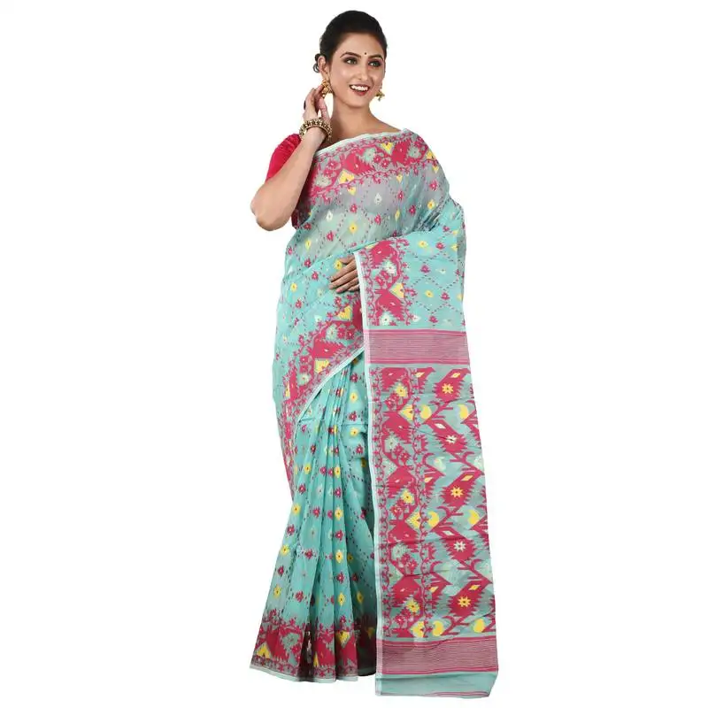 • Aishani collection woven cotton silk dhakai jamdani saree (green, red)