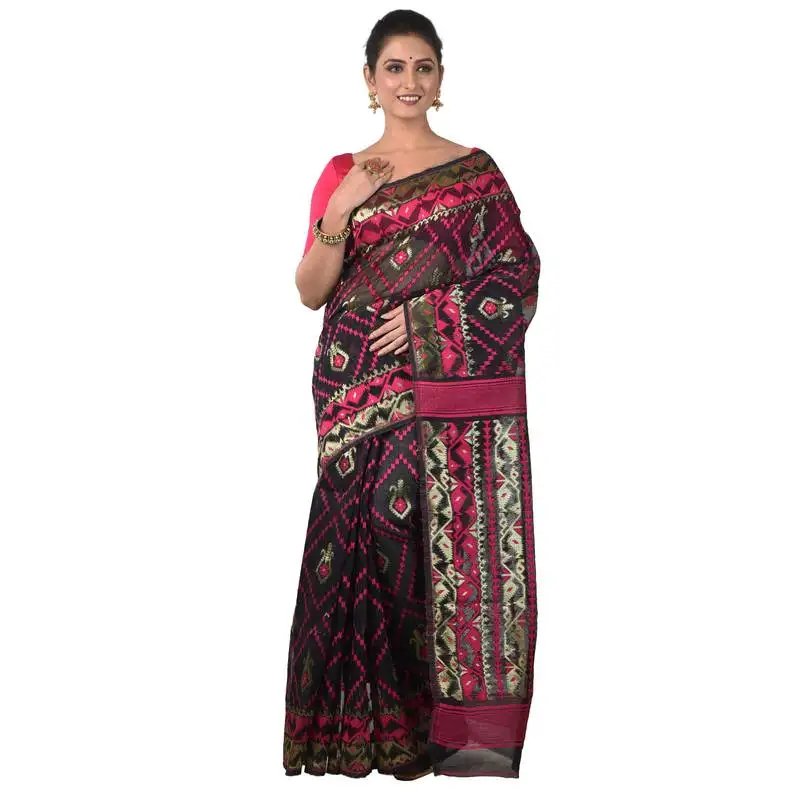 • Aishani collection woven cotton silk dhakai jamdani handloom saree (black, pink)