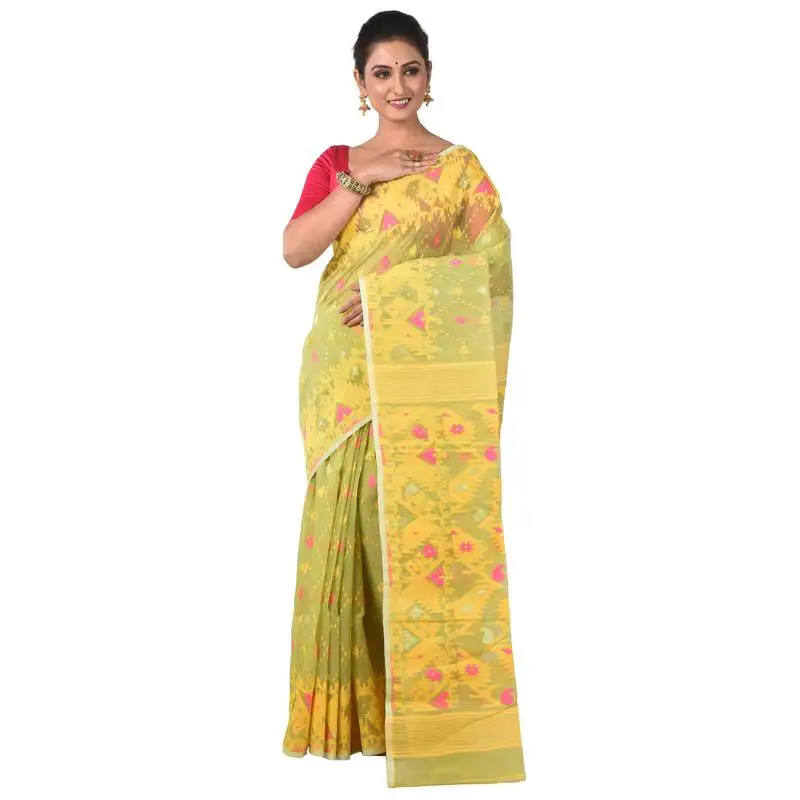 • Aishani collection woven cotton silk dhakai jamdani handloom saree (green, yellow)