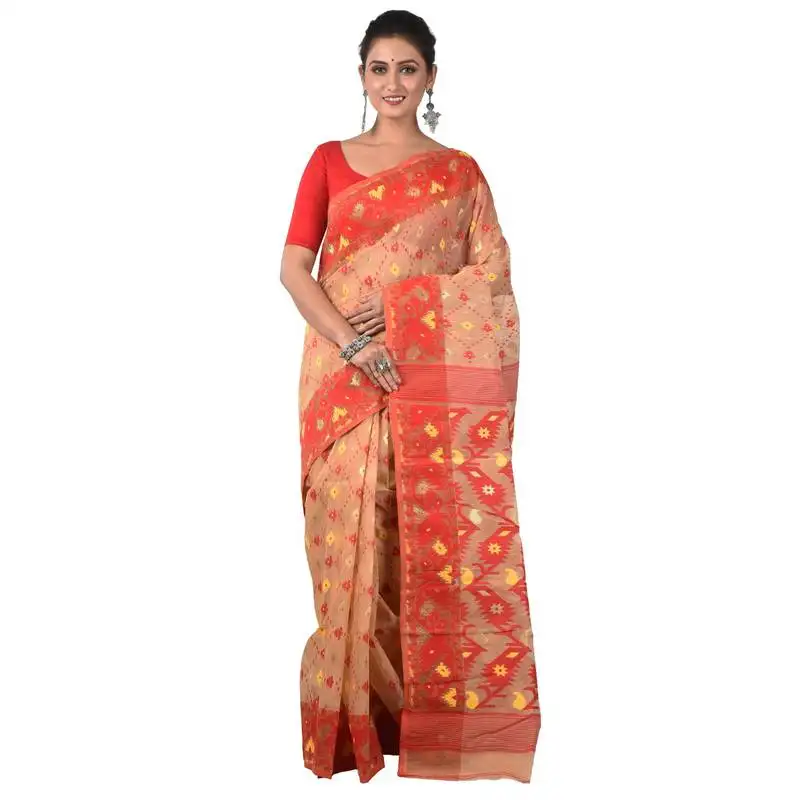 • Aishani collection woven cotton silk dhakai jamdani handloom saree (beige, red)