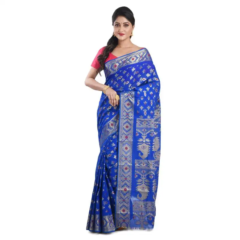 • Aishani collection pure cotton resham jamdani handloom saree with bp (blue)