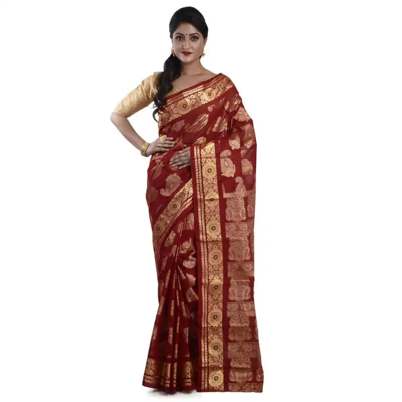 Aishani collection pure cotton resham jamdani handloom saree with bp (maroon)