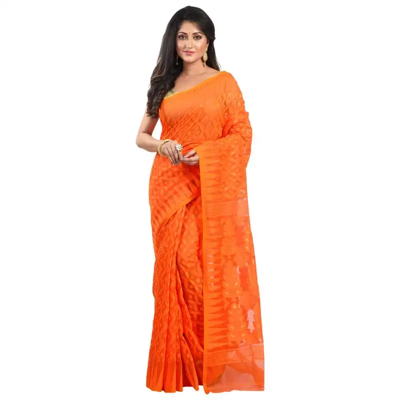 Aishani collection woven cotton silk dhakai jamdani handloom saree (orange)