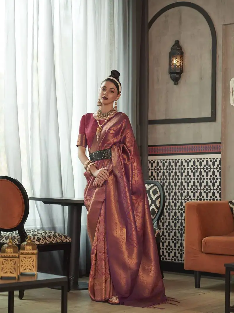 Wine silk blend copper zari woven border and rich pallu saree with blouse for women