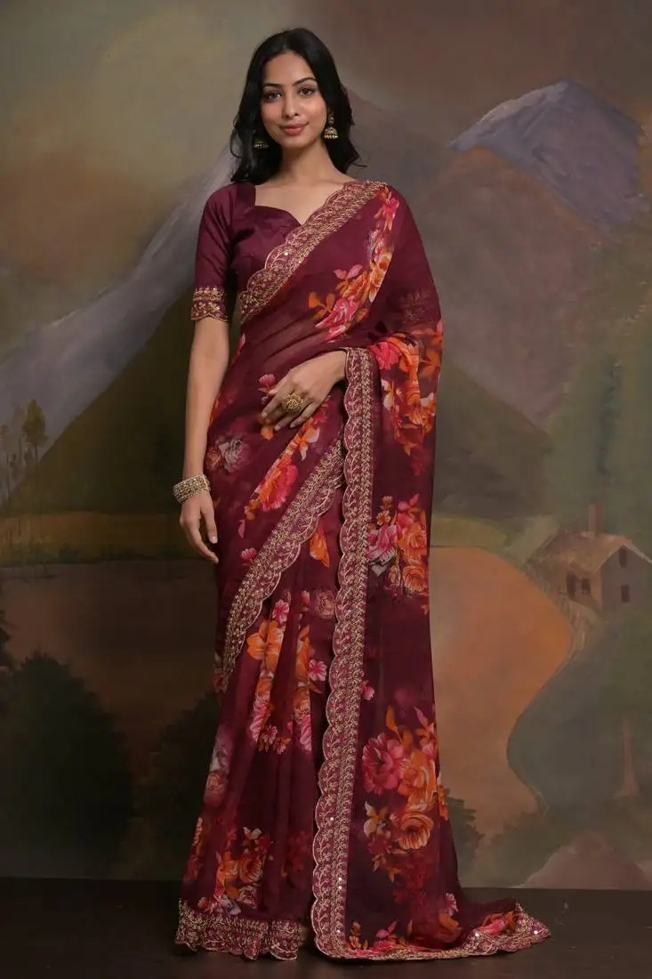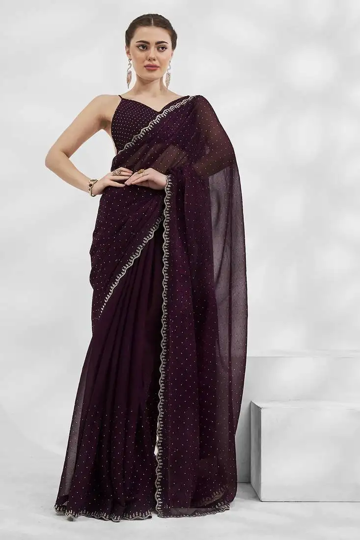wine shimmer chiffon c designer girlish heavy partywear saree