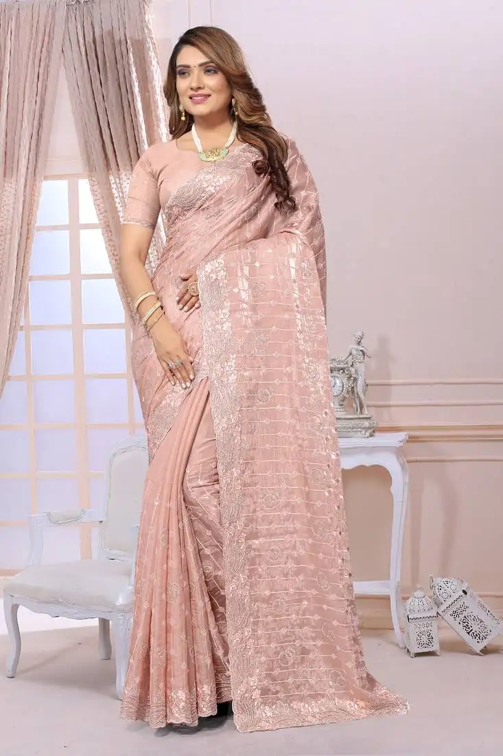 Women’s peach zari resham organza silk party wear wedding saree with blouse piece